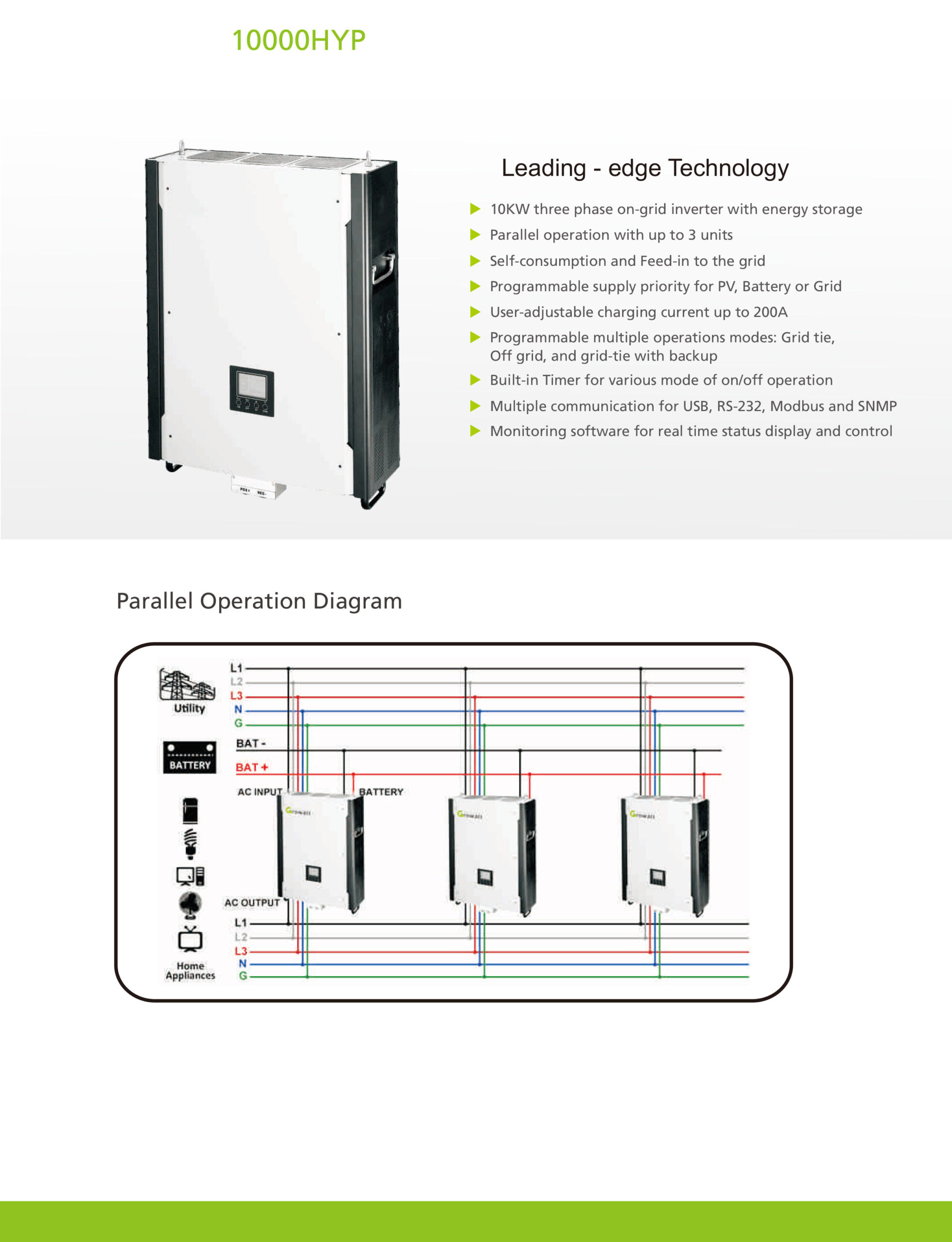 Onduleur solaire hybride est compatible avec les systèmes PV connectés au réseau et hors réseau. Il peut contrôler intelligemment le flux d’énergie. Pendant la journée, l’installation photovoltaïque produit de l’électricité qui peut être fournie aux charges, introduite dans le réseau ou charger la batterie. L’électricité stockée peut être libérée lorsque les charges l’exigent, par exemple pendant la nuit. De plus, le réseau peut également être utilisé pour charger les périphériques de stockage via l’onduleur (fonction UPS).